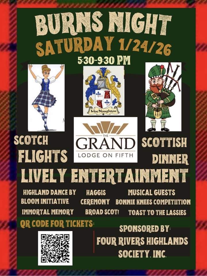At 6:30 pm, the event moves upstairs where Tomi Blom of The Grand Lodge curated a delicious Scottish dinner and Peter Barnett of Piper’s Tea and Coffee crafted three Scottish inspired cocktails. During dinner, the night will be filled with lively and very talented entertainment including; great music, poetry, history, tradition and laughter to celebrate the life and works of Scotland’s most celebrated poet, Robert Burns.