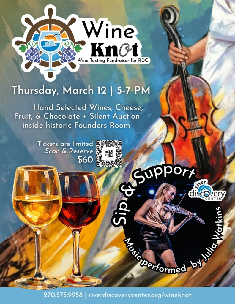 Join us for Wine Knot, a lively wine tasting fundraiser benefiting the River Discovery Center, on Thursday, March 12 from 5–7 PM in the historic Founders Room. Guests will enjoy a curated selection of hand-picked wines paired with cheese, fruit, and chocolate, along with an exciting silent auction—all set against a warm, welcoming atmosphere inspired by our river heritage. The evening will also feature live music by Julia Watkins, adding an elegant and energetic touch to this special gathering. Tickets are $60 and space is limited, so we encourage you to reserve your spot and be part of an evening that celebrates community while supporting the important educational mission of the River Discovery Center.